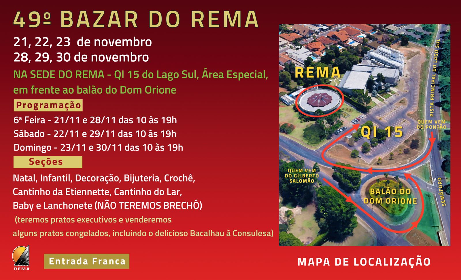 O 49º Bazar do Rema, uma das feiras mais tradicionais e queridas de Brasília, já começa na próxima semana! As datas serão as seguintes: 21, 22 e 23 de novembro e 28, 29 e 30 de novembro – sempre sexta, sábado e domingo, das 10h às 19h, na área especial da QI 15 do Lago Sul, em frente ao balão do Dom Orione.