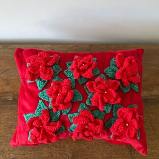 Almofada retangular vermelha flores crochê