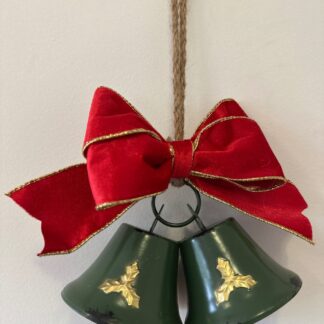 Enfeite Porta 2 Sinos Verdes Laço Fita Veludo Vermelho