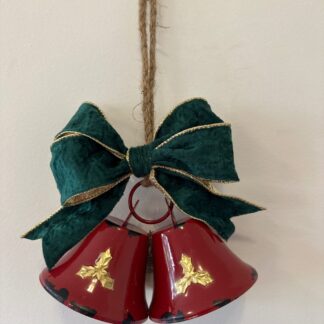 Enfeite Porta 2 Sinos Vermelhos Laço Fita Veludo Verde