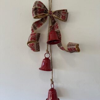 Enfeite Porta 3 Sinos Vermelhos Laço Fita Flocos de Neve
