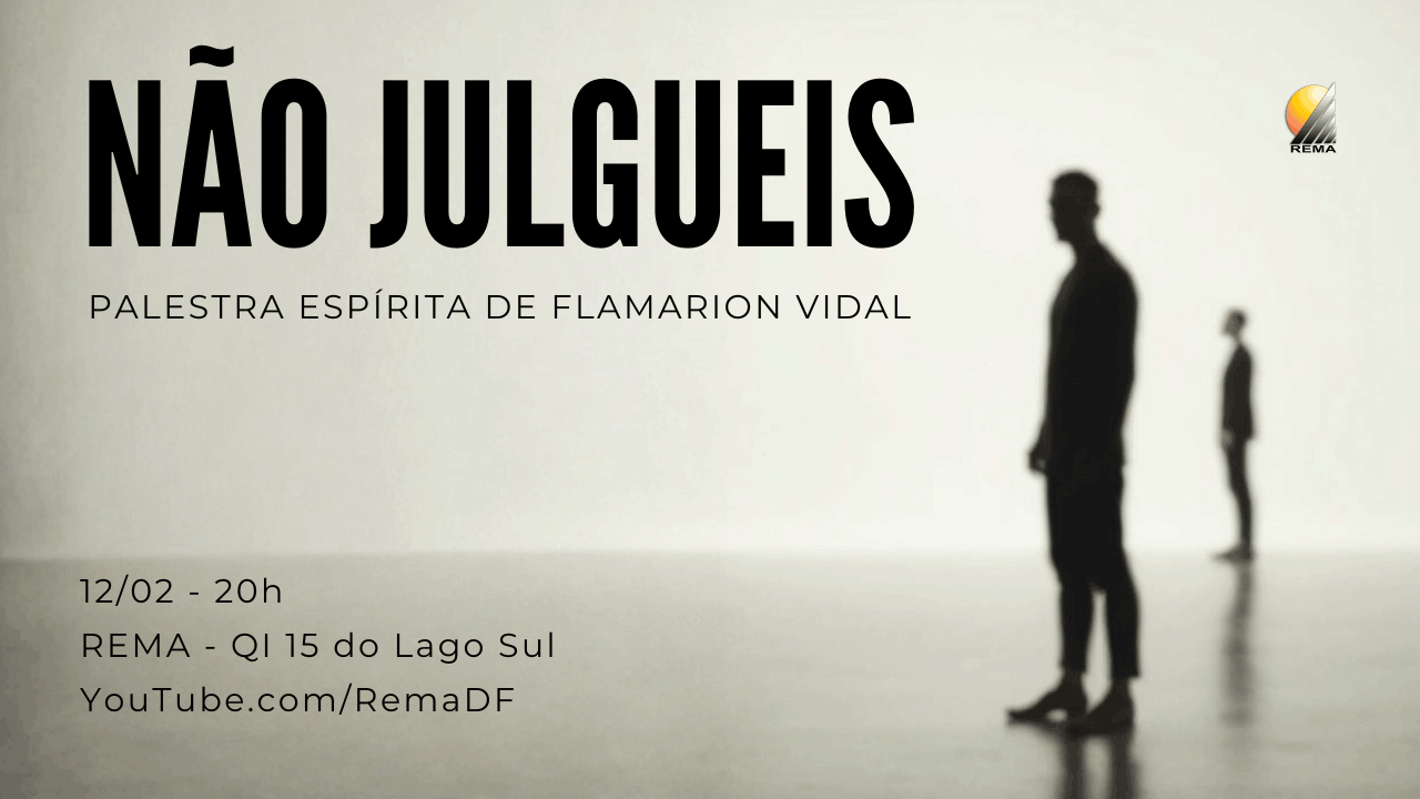 Palestra de Flamarion Vidal: “Não julgueis” – 12/02 11 de fevereiro de 2026 por Rema Deixar um comentário Nesta quinta-feira (12/02), teremos no Rema uma palestra do orador espírita Flamarion Vidal sobre o tema “Não julgueis”. Início: 20h Passe: 20h50 Rema: QI 15 do Lago Sul A palestra será transmitida no nosso canal: www.youtube.com/RemaDF
